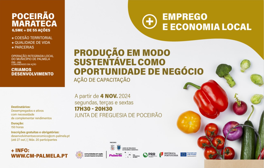 O Município de Palmela promove, a partir do dia 4 de novembro, na Junta de Freguesia de Poceirão, a ação de capacitação “Produção em Modo Sustentável como Oportunidade de Negócio”.