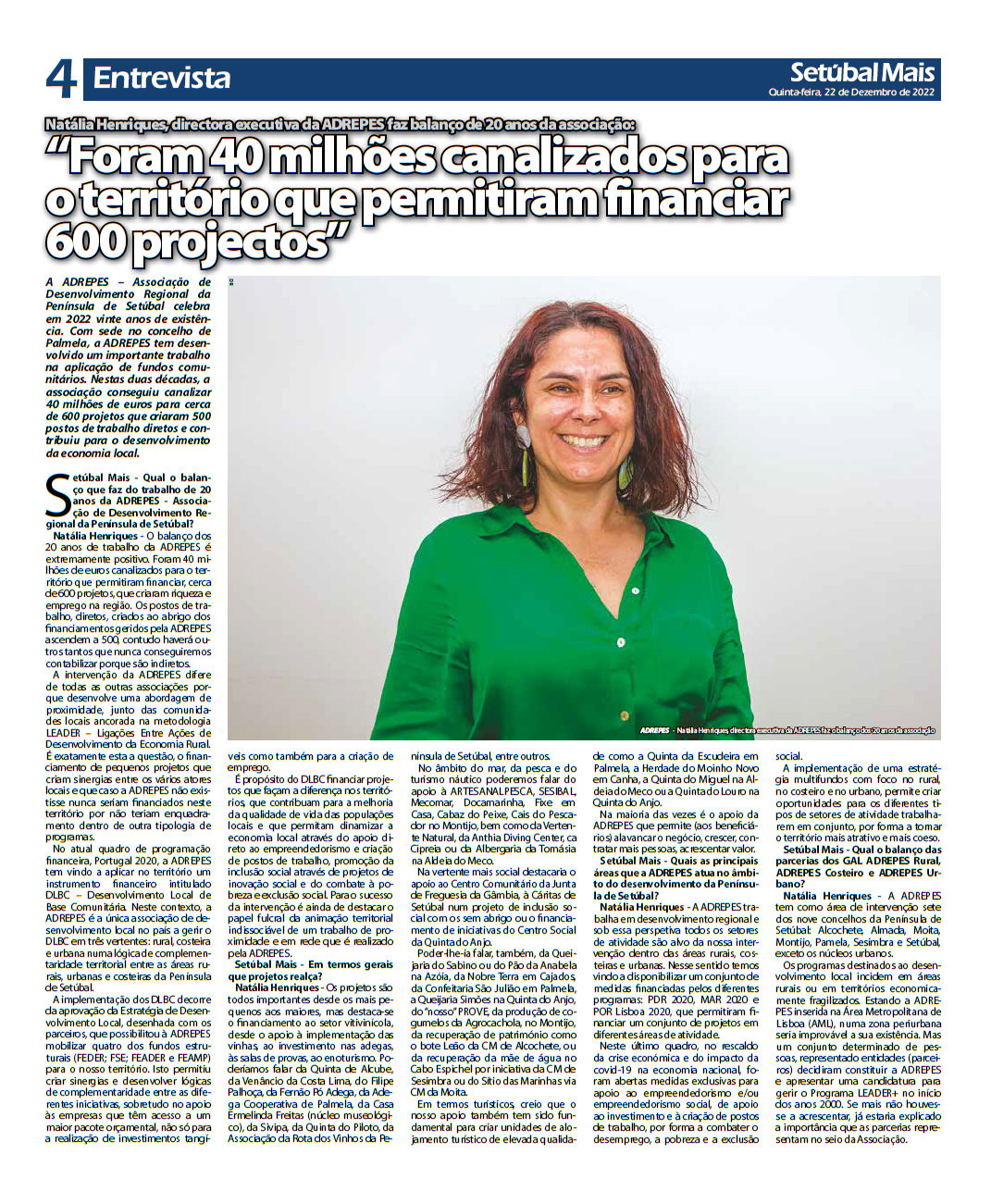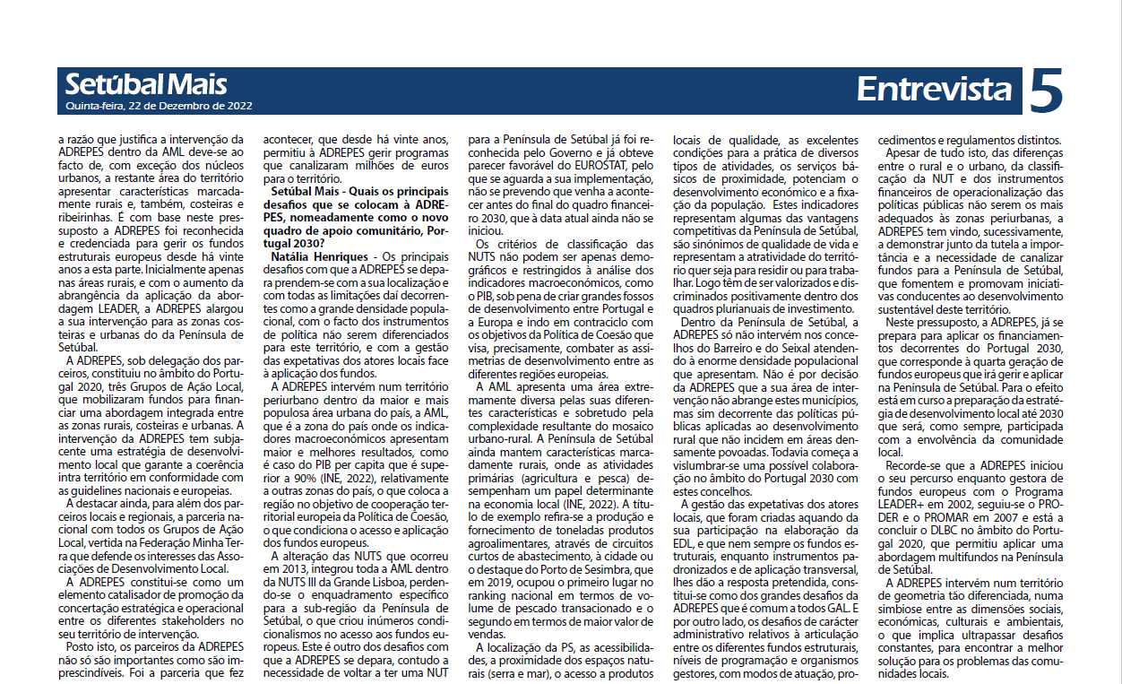 O jornal SetúbalMais publica na edição de 22/12/2022 entrevista a Natália Henriques, Diretora Executiva da ADREPES, onde é feito o balanço da atividade da associação na comemoração do seu 20º aniversário.