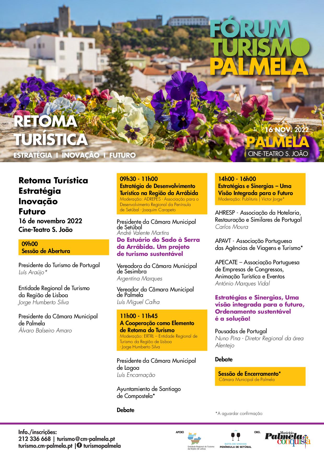 O Município de Palmela irá realizar, no dia 16 de novembro de 2022, o Fórum Turismo Palmela, subordinado ao tema: “Retoma Turística: Estratégia, Inovação, Futuro”.